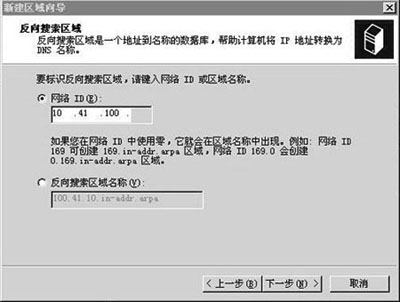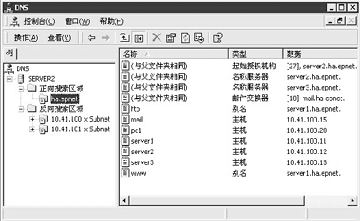 图1 单击“下一步”。 4. 选择创建新的区域文件,文件名为100.41.10.in-addr.arpa.dns。单击“下一步”→“完成”。 对于网段10.41.101.0重复上述操作,在第三步中,输入网络号10.41.101,创建的区域文件为101.41.10.in-addr.arpa.dns。 控制台树中的“反向搜索区域”下出现创建的对应两个网段的两个反向搜索区域,名字显示为“10.41.100.x Subnet”和“10.41.101.x Subnet”。 ■添加资源记录的类型 创建标准主要区域之后,需要向该区域添加资源记录(RR)。最常用的资源记录类型是: 起始授权机构(SOA):指明该区域的主服务器,是区域信息的主要来源。它还指明区域的版本信息和影响区域更新或期满的时间等基本属性。 名称服务器(NS):标记附加的DNS服务器,是该区域的权威服务器。名称服务器可能不止一个。在默认情况下,使用DNS管理单元来添加新的主区域时,“添加新区域”向导会自动创建SOA和NS。 主机记录(A):用于将DNS域名映射到计算机使用的IP地址。这是最常使用的资源记录类型。可以手动创建主机记录。当IP地址配置更改时,运行Windows 2000的计算机可以动态注册和更新它们在 DNS 中的主机记录。 别名(CNAME):用于将DNS域名的别名映射到另一个主要的或规范的名称。允许用多个名称指向一个主机。例如一台名称为Server1.ha.epnet的计算机同时运行FTP服务和Web服务,为了规范化你想为FTP服务使用名称ftp.ha.epnet,为Web服务使用名称www.ha.epnet,那么你需要为server1.ha.epnet创建两个别名记录ftp和www。 邮件交换器(MX):用于将DNS域名映射为交换或转发邮件的计算机的名称。邮件交换器资源记录由电子邮件系统使用,用以根据在邮件目标地址中的DNS域名来定位邮件服务器。如果你为域ha.epnet配置的MX的邮件服务器是mail.ha.epnet,则发送到user@ha.epnet的邮件首先发往user@mail.ha.epnet。MX中定义的邮件服务器可以是你本地网络中连入Internet的邮件服务器,也可以是Internet上任一台邮件服务器,只要它允许接收你的邮件。 指针(PTR):是在反向搜索区域中创建的一个映射,用于把计算机的IP地址映射到DNS域名,它仅用于支持反向搜索。可以静态手动创建指针记录,也可以在创建主机记录时创建相关的指针记录;当IP配置更改时,运行Windows 2000的计算机可以动态注册和更新它们在DNS中的指针记录。 服务位置(SRV):用于将DNS域名映射到指定的DNS主机列表,该DNS主机提供诸如Active Directory域控制器之类的特定服务。 ■添加资源记录举例 下面举例在主服务器Server2上创建各种资源记录。 添加主机资源记录和相关的指针资源记录 我们将为名为pc1的主机建立主机记录,同时创建相关联的指针记录。 1.在DNS控制台树中单击选中区域ha.epnet,单击选单“操作”→“新建主机”,弹出“新建主机”窗口。 2.在“名称”栏输入主机名pc1,在“IP地址”栏输入对应的IP地址10.41.100.20,选中“创建相关的指针(PTR)记录”,单击“添加主机”按钮。单击“完成”。 名为pc1的主机记录出现在正向搜索区域“ha.epnet”中,同时名为10.41.100.20的相关指针记录出现在反向搜索区域“10.41.100.x Subnet”中。pc1的完全合格域名(FQDN)为pc1.ha.epnet。 添加邮件交换记录 下面为域ha.epnet建立邮件交换器记录,邮件服务器名为mail。 1.首先如上述操作步骤在区域ha.epnet中为邮件服务器建立名为mail的主机记录。 2.在DNS控制台树中单击选中区域ha.epnet,单击选单“操作”→“新建邮件交换器”,弹出“新建资源记录”窗口。 3.保留“主机或域”栏为空,在“邮件服务器”栏中输入或单击“浏览”按钮选择邮件服务器名mail.ha.epnet。单击“确定”,域ha.epnet的邮件交换记录出现在区域ha.epnet中。 添加别名记录 下面为同时运行Web服务和FTP服务的主机Server1建立两个别名www和ftp。 1.在区域ha.epnet中为Server1建立名为Server1的主机记录。 2.在DNS控制台树中单击选中区域ha.epnet,单击选单“操作”→“新建别名”,弹出“新建资源记录”窗口。 3.在“别名”栏中输入Server1的别名“www”,在“目标主机的完全合格名称”输入或单击“浏览”按钮选择Server1.ha.epnet。单击“确定”。 4.重复上述操作,第三步在“别名”栏中输入Server1的另一个别名“www”。 Server1的两个别名www和ftp出现在区域ha.epnet中。