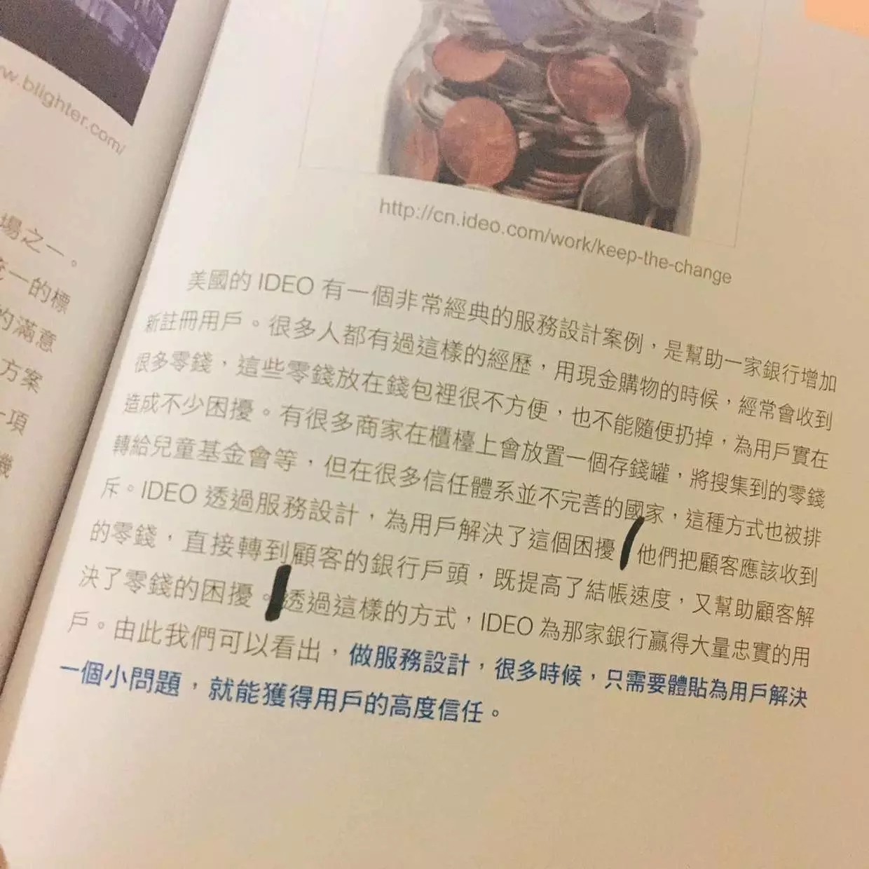 比如美国IDEO有一个非常成功的案例:帮助一家银行增加新注册用户。比如现金购物时经常收到零钱,放钱包不方便,又不想丢掉或放到商家准备的慈善捐款罐中(本质上是对捐款的不信任)。IDEO将顾客应该收到的零钱,直接转到其银行账户,既提高了结账速度,又为那家银行赢得了大量忠实用户。
