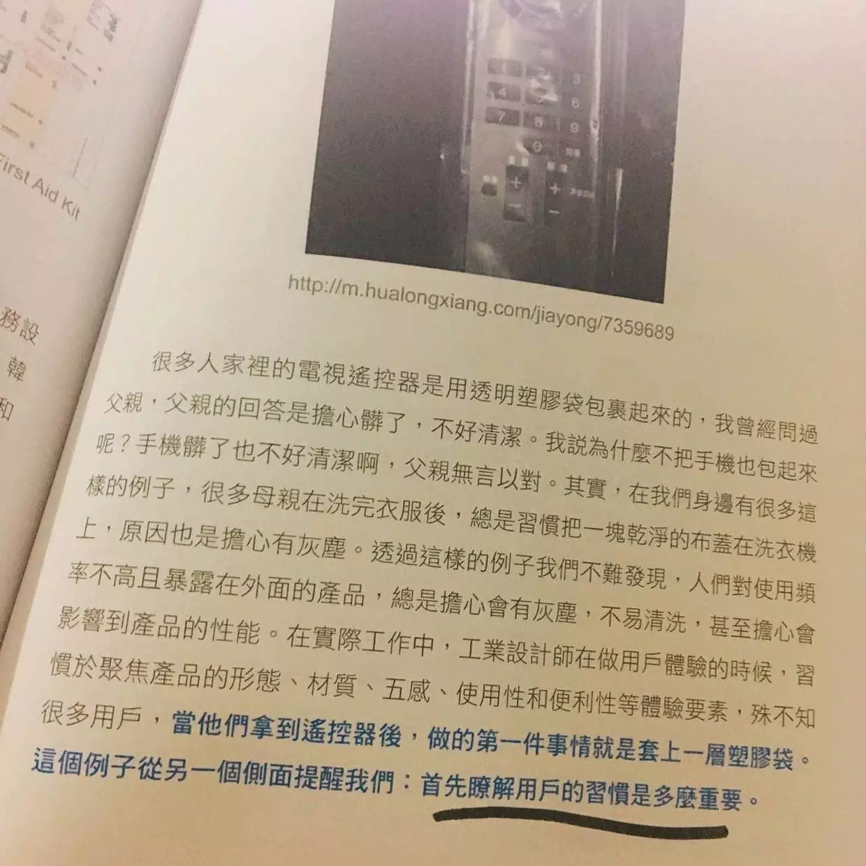 举个例子:遥控器的工业设计师在做用户体验时,习惯聚焦产品的形态,材质,五感,使用性和便利性等体验要素,却不知道用户拿到遥控器后做的第一件事就是套上一层塑料袋。