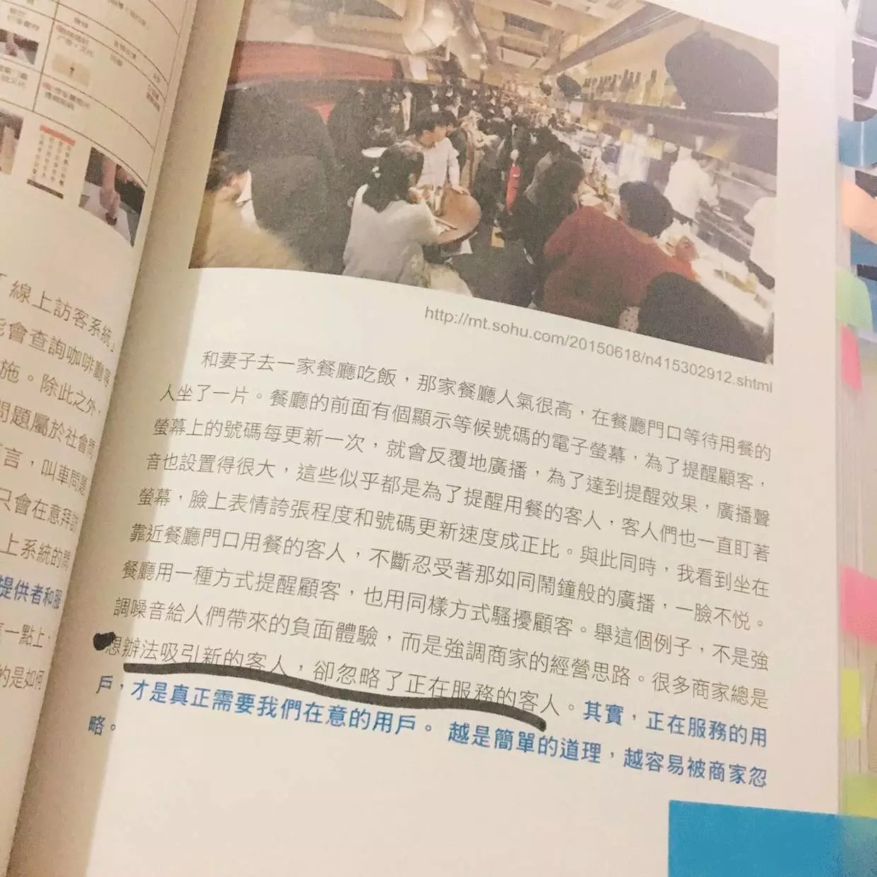 比如很多餐厅有提示等候号码的电子屏幕。并在更新号码时反复大声广播:XX号客户,请您用餐。这确实是等待用餐的客户迫切想要知道的信息,但也给正在用餐的客户带来了噪音骚扰。餐厅用一种办法吸引还未服务的客户,也用同样的方式骚扰着正在服务的客户。这个例子,不是为了说明噪音的负面体验,还是强调品牌方的经营思路。