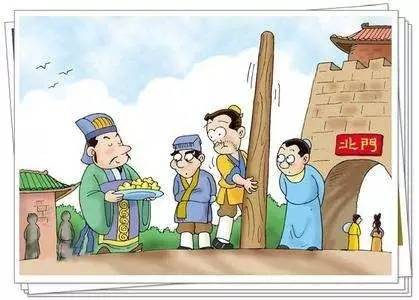 春秋战国时,秦国的商鞅在秦孝公的支持下主持变法。当时处于战争频繁、人心惶惶之际,为了树立威信,推进改革,商鞅下令在都城南门外立一根三丈长的木头,并当众许下诺言:谁能把这根木头搬到北门,赏金十两。围观的人不相信如此轻而易举的事能得到如此高的赏赐,结果没人肯出手一试。于是,商鞅将赏金提高到50金。重赏之下必有勇夫,终于有人站起将木头扛到了北门。商鞅立即赏了他五十金。商鞅这一举动,在百姓心中树立起了威信,而商鞅接下来的变法就很快在秦国推广开了。新法使秦国渐渐强盛,最终统一了中国。