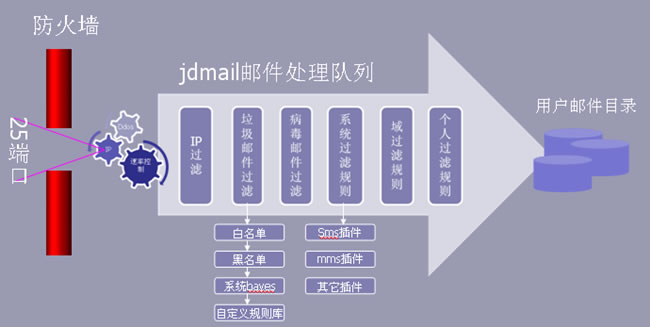 jdmail对付垃圾邮件,采用“鸡尾酒”疗法。即:通过多种技术手段,从网络层、会话层、内容层进行全面过滤。