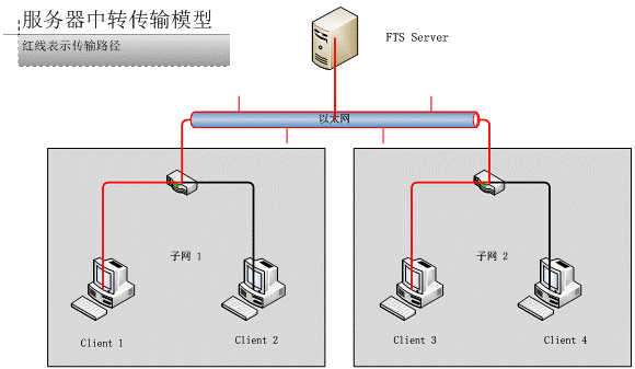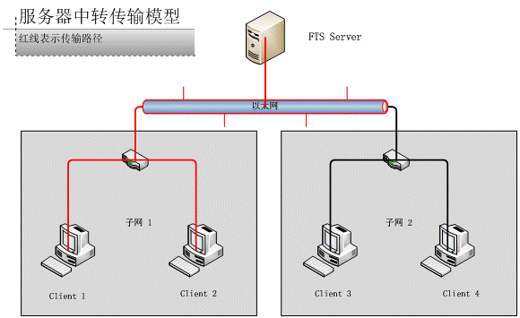 通过服务器中转的模型时尽管Client 1和Client 2在同子网,但它们之间的数据传输却不能限定在子网内进行,而必须绕一大圈子,数据到达外网的服务器FTS Server之后,再由FTS Server回传给目标客户端。