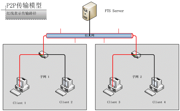 我们再来考虑另一种情况,假设Client 1发送文件给Client 2,由于Client 1 与Client 2同在一个子网中,有另于Client 1与Client3,这时的P2P通信只需要子网中。
