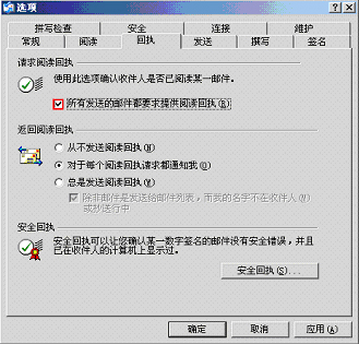 在弹出的选项对话框中选择“回执”标签,接着我们就可以看到一个与回执有关的标签界面,在该界面中我们可以发现,回执功能只有在对方收到了我们的邮件并打开以后才发挥作用,如果我们发出的邮件有回执要求,对方即可作出相应的答复。这就类似于我们寄发了挂号信,要收信人看信并签字画押后再寄回回执。只要收到回执,就说明自己的邮件已经送达并且对方已经看到了,至于具体的回复与否就看邮件的具体内容、要求和对方的理解了。
