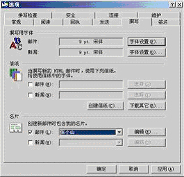 ③ 在“选项”对话框中切换到“撰写”选项卡,在“片”项目中的“邮件”前面打上钩,接着在旁边的下拉框中选择自己的名片。