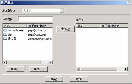 接着单击"增加"按钮,打开"选择地址"对话框,利用此对话框选择所有需要添加到"邮件列表"中的电子邮件地址;再单击"确定"按钮,关闭"选择地址"对话框;最后单击"确定"按钮,关闭"邮件组"对话框即可