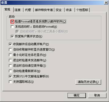 然后复选"常规"选项卡中的"检查Foxmail是否是系统默认邮件软件"选项即可。这样此后每次启动Foxmail时,系统都会自动检查Foxmail是否为系统默认邮件软件,若不是,系统就会弹出一个对话框,询问您是否将Foxmail设为默认邮件软件,我们只需从中选择"是"按钮即可。