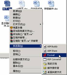 安装Foxmail之后,在资源管理器或我的电脑中右击某个文件时,系统弹出的快捷菜单"发送"子菜单中会多出一个"Foxmail"命令。您若拟使用Foxmail的这一新增功能,只需在资源管理器或我的电脑中选择一个或多个希望发送出去的文件,然后单击鼠标右键,并从弹出的快捷菜单“发送”子菜单中执行"Foxmail"命令,系统即会自动启动Foxmail,打开一个新邮件撰写窗口,并将用户选定的文件作为附件插入到该邮件窗口中,我们只需输入收件人的电子邮件地址,然后即可直接将这些文件发送出去了,使用非常方便。